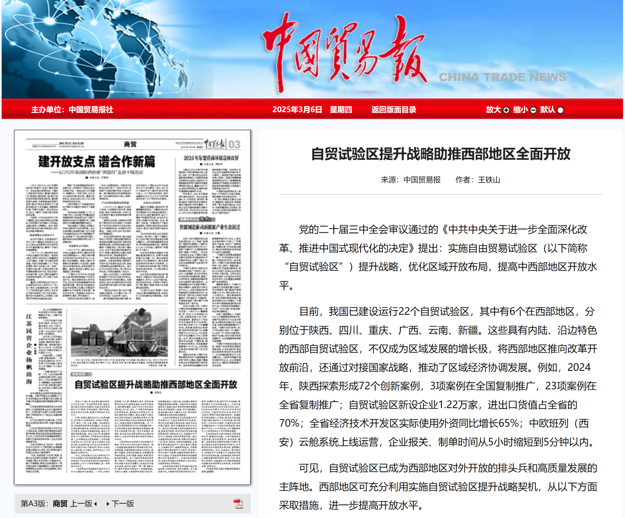3月6日,由中国贸促会主办的《中国贸易报》刊登了公司经理助理王铁山副教授的文章《自贸试验区提升战略助推西部地区全面开放》。