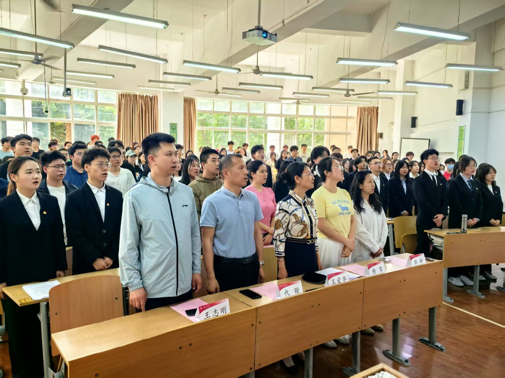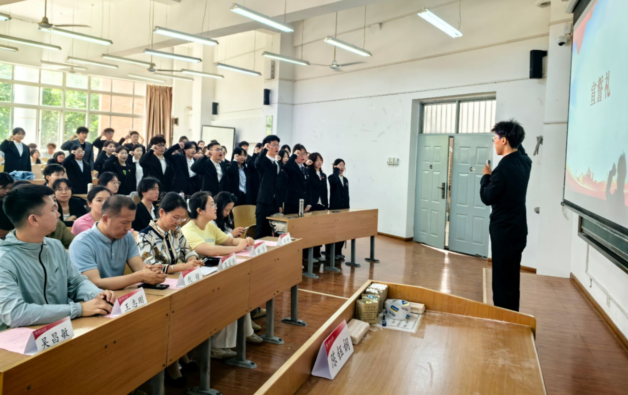 活动在庄严的国歌声中拉开序幕。入团仪式上,参会老师、团干部和优秀团员代表为新团员代表佩戴团徽,新团员们面向团旗庄严宣誓,铿锵誓言彰显着新时代青年“请党放心,强国有我”的使命担当。