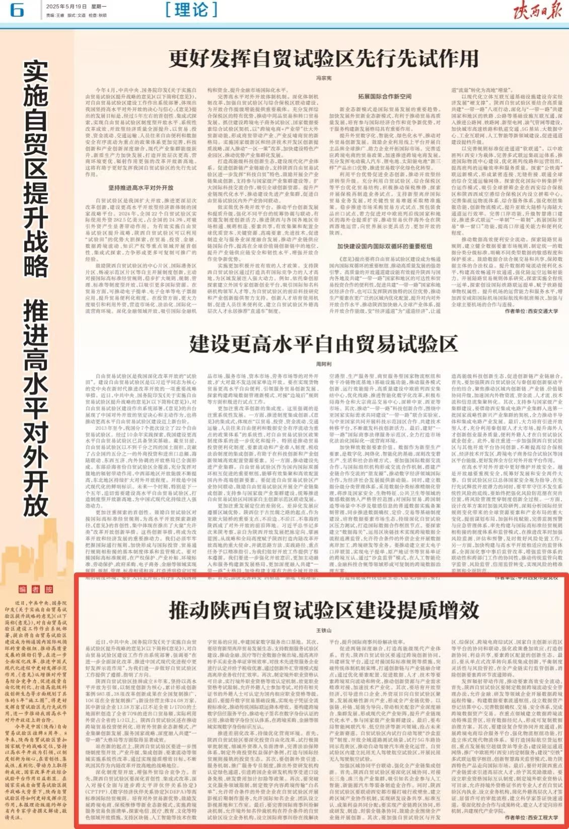 5月19日,陕西日报(理论版)刊登了王铁山副教授的文章《推动陕西自贸试验区建设提质增效》。