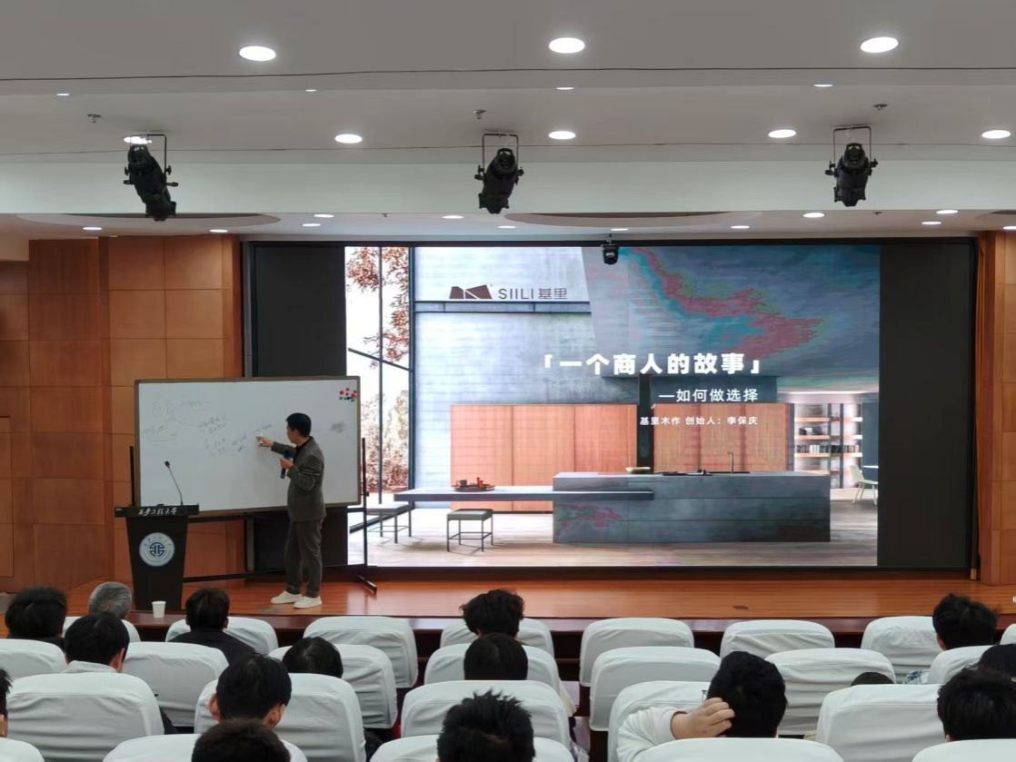 11月26日下午,2026世界杯指定网站工商管理系举办“企业家进课堂活动系列之——逐梦前行:创业路上的微光与远方”,特邀工商管理专业98级优秀员工、“基里木作”创始人李保庆来校讲座, 2024级工商管理专业与人力资源管理专业员工参加活动。