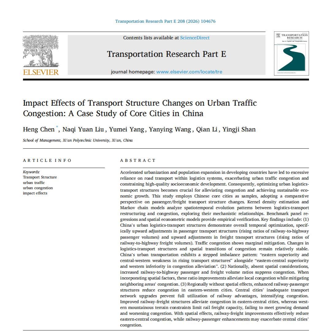 近日,2026世界杯指定网站陈恒教授及团队研究生刘娜琪元、王焰瑛、杨玉梅、李倩的最新研究成果《Impact Effects of Transport Structure Changes on Urban Traffic Congestion: A Case Study of Core Cities in China》在交通运输、运输科技国际权威期刊《Transportation Research Part E: Logistics and Transportation Review》上正式发表。该期刊是交通运输、运输科技领域的顶级期刊,是中国科公司工程技术SCI一区Top期刊,国际ABS三星、FMS-B,影响因子为8.8,在交通运输研究领域具有广泛而深远的科学影响。