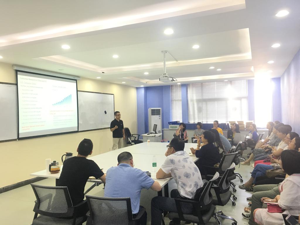 讲座开始,蔡懿教授首先对中美两国消费者研究概况及美国个人与家庭金融产品管理体系框架做了详细介绍与对比,接着结合自身研究方向与经历,围绕消费经济学中消费风险承受力、中国老年人群聚类分析、消费者在线支付意愿与情感及绿色消费等研究方向进行交流,蔡教授强调,多领域多学科交叉研究已经成为新的研究趋势,针对消费者行为的研究可以和经济学、心理学、社会学或是地理、哲学等学科进行交叉融合研究,并举例介绍了综合研究模型与方法。活动最后,蔡教授与参会教师在国内研究领域优势与问题、待发展方向及国际交流与合作前景展望等展开了热烈的交流与讨论,对师生们研究目标、研究思路、研究框架等方面的问题给出了意见与建议。