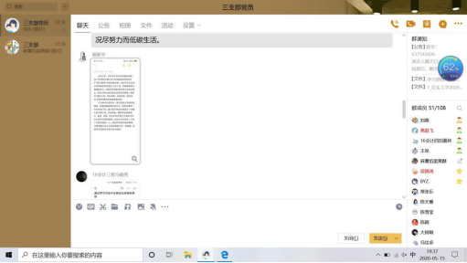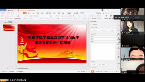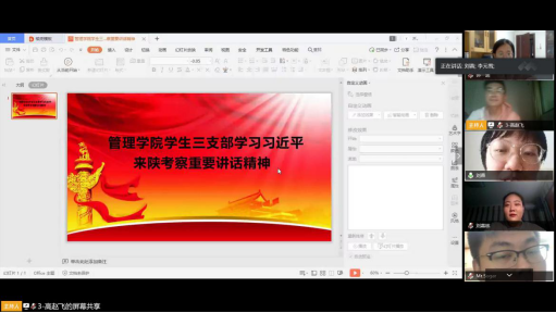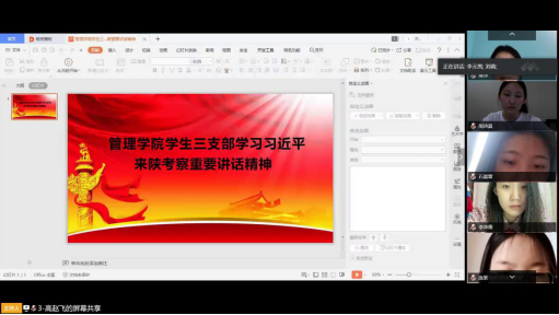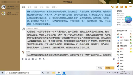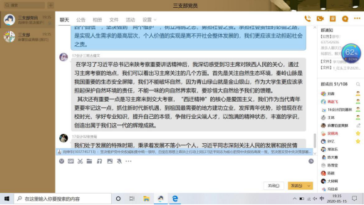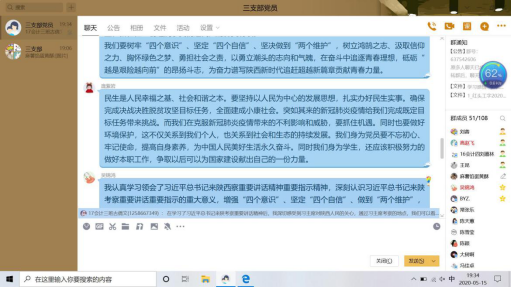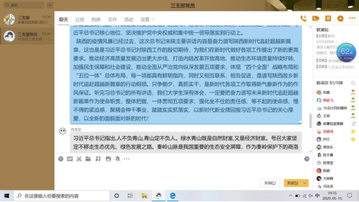 首先,刘蓉带领全体参会人员认真学习了《关于深入学习习近平总书记来陕考察重要讲话精神重要指示精神的通知》【西工程大工字(2020)2号】文件的两个附件——《习近平在陕西考察时强调 扎实做好“六稳”工作落实“六保”任务 奋力谱写陕西新时代追赶超越新篇章》和《认真学习宣传贯彻落实习近平总书记重要讲话重要指示 只争朝夕真抓实干奋力谱写陕西新时代追赶超越新篇章——陕西省委常委会(扩大)会议传达学习习近平总书记来陕考察重要讲话 重要指示精神》。随后,党员们展开了热烈讨论。
