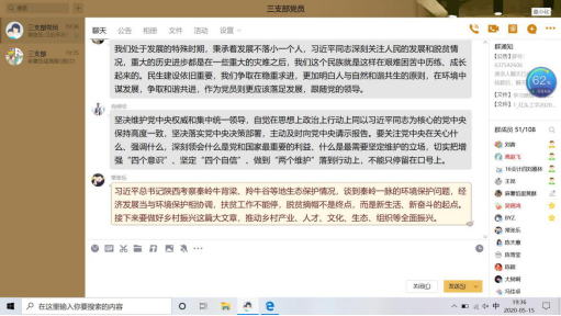 最后,刘蓉总结发言,要求青年党员要树牢“四个意识”、坚定“四个自信”、坚决做到“两个维护”,树立鸿鹄之志、汲取信仰之力、胸怀绿色之梦、勇担社会之责,以勇立潮头的志向和气魄,在奋斗中追逐青春理想,砥砺“越是艰险越向前”的昂扬斗志,为奋力谱写陕西新时代追赶超越新篇章贡献青春力量。