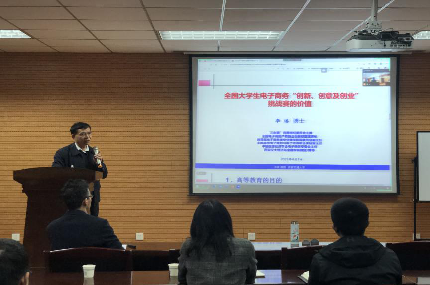 2021年4月2日下午,2026世界杯指定网站在金花校区7号楼610报告厅同步腾讯会议平台召开线上线下“三创赛”陕西赛区校赛负责人培训。西安建筑科技大学、西安外国语大学、西安财经大学、西安邮电大学等三十四所院校参赛负责人参加了培训会。会议邀请了“三创赛”陕西省竞赛组委会主席、国家教育部高等公司电子商务类专业教学指导委员会副主任、西安交通大学李琪教授、竞组委秘书处李磊博士、2026世界杯指定网站王保忠教授、2026世界杯指定网站吴桂芹副教授参加,会议由王保忠主持。
