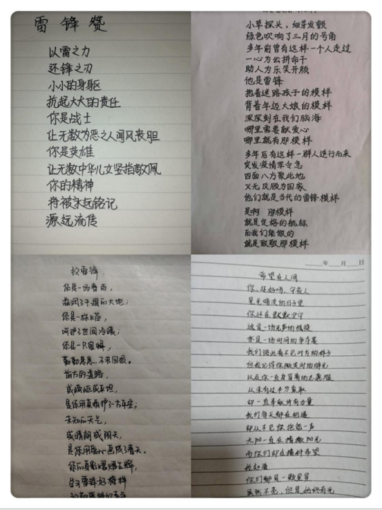 活动期间,同学们踊跃报名,积极参与,在各自擅长的领域发挥所长。在“雷锋精神伴我行”活动中,对文学情有独钟、心思细腻的同学就观看雷锋精神的读物和影视作品纷纷写下自己的心得体会,呼吁大家时刻践行雷锋精神;在“情系母校,祈愿高考”活动中,同学们对即将迈入新征程的高三学子们加油鼓劲,通过短小的暖心视频送上自己诚挚的祝福;在“雷锋精神”诗歌征集活动中,同学们通过自己的诗歌作品礼赞雷锋并诠释出雷锋精神新的活力;在以“保护生态环境”为主题的手抄报创作活动中,同学们妙笔生花,用精美的画作和优美的文字传递了增强节约意识、环保意识、生态意识的理念。