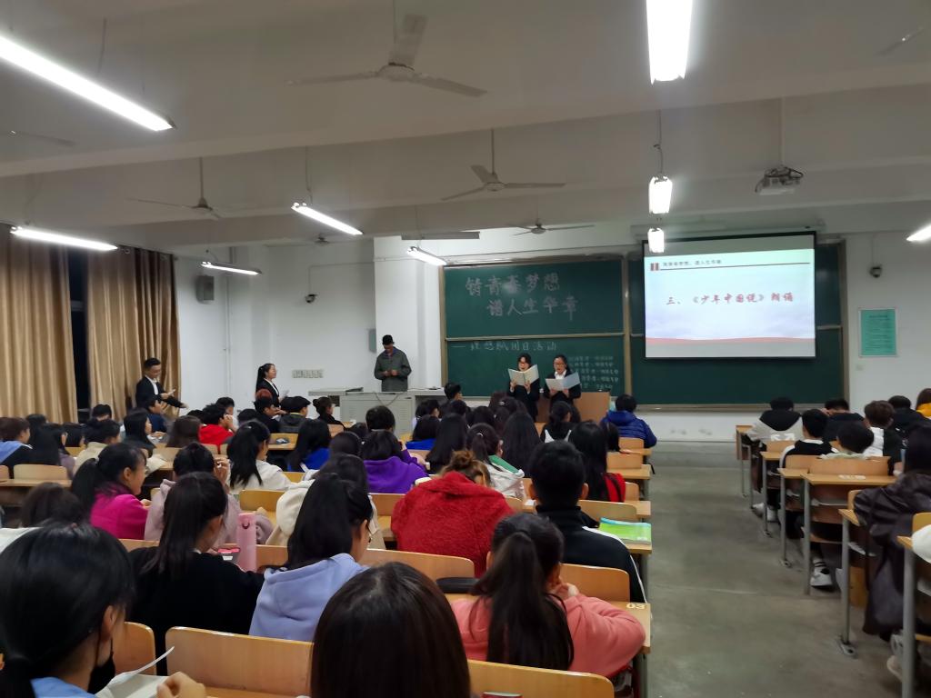 2019级人力资源管理1班团支部的张梦丽、王鹏冲朗诵《少年中国说》,两位同学声情并茂,全场团员青年都被她们的激情所感染。“故今日之责任,不在他人,而全在我少年。少年智则国智,少年富则国富,少年强则国强,少年独立则国独立,少年自由则国自由,少年进步则国进步。”朗诵结束后,教室内响起阵阵掌声。身为团员青年我们要树立远大理想,确定学习目标以及努力方向,强化对自身责任和使命的认识,努力过好属于自己的老员工活。