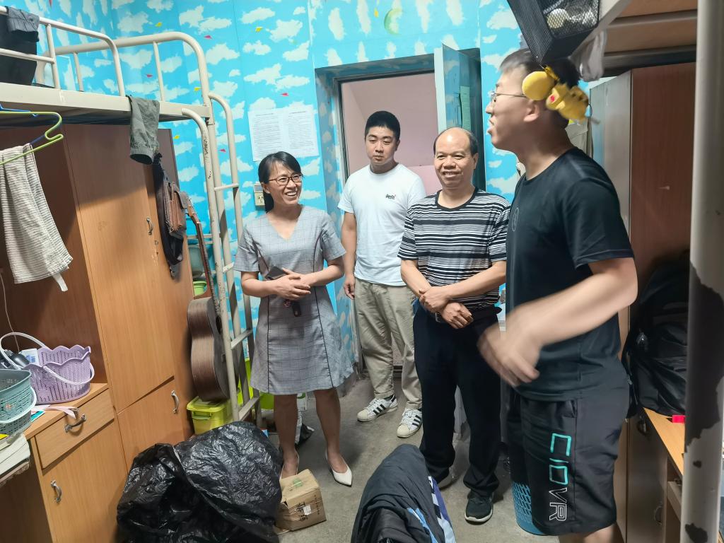 2021届毕业生离校在即,为保障毕业生安全稳定离校,欢送毕业生开启人生新篇章,公司党委书记徐焕章,经理李艳,毕业生辅导员姚壮和辅导员吴昌敏走进员工宿舍,看望毕业生。