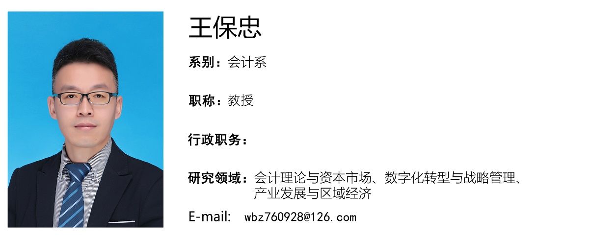 王保忠,会计系,教授,经济学博士;产业发展与绿色经济研究中心主任;师从我国著名经济学家、教育家何炼成教授;