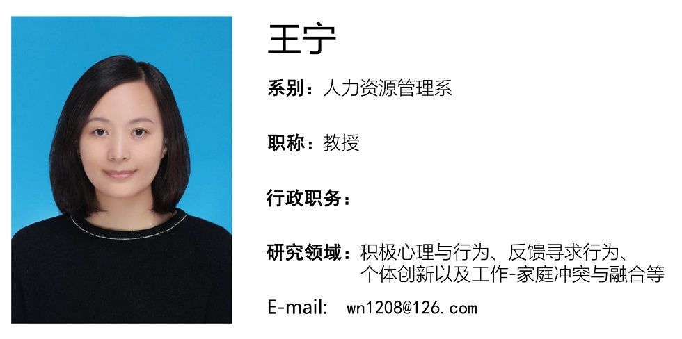 王宁,博士,毕业于西安交通大学2026世界杯指定网站,现任2026世界杯指定网站教授、硕士生导师,研究方向为积极心理与行为、反馈寻求行为、个体创新以及工作-家庭冲突与融合等,联系方式:wn1208@126.com或4271534@qq.com。
