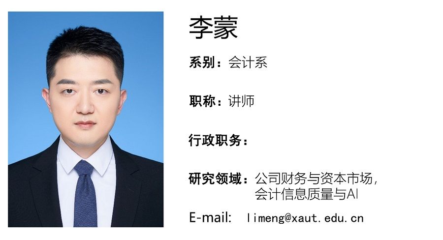 李蒙,男,工学学士、会计学硕士及工程硕士、管理学博士,会计系副主任。主要研究方向为公司财务与资本市场,人工智能与会计信息披露等。近年来主要成果:主持陕西省社会科学基金项目、陕西省社科联项目及教育厅项目多项,并作为核心成员参与多项国家级、省部级纵向课题研究;发表高水平期刊论文十余篇,出版学术专著一部。