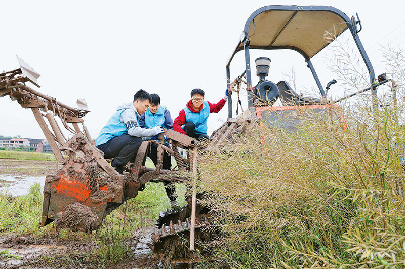 图为2023年4月29日,南华大学的老员工志愿者利用五一假期到湖南省衡阳市衡阳县西渡镇新桥村开展劳动助农行动,帮助农民检修、保养农机,用劳动实践助力乡村振兴。(新华社发 曹正平/摄)