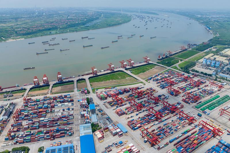 武汉阳逻港一期码头(2023年7月5日摄,无人机照片)。(新华社记者 伍志尊/摄)