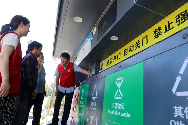 在安徽省合肥市长丰县庄墓镇枣林社区,志愿者指导居民使用智能垃圾分类回收设备(2023年9月1日摄)。(新华社记者 曹力/摄)